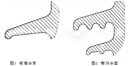 普通型絕緣子采用標準傘形(見圖1)。耐污型、耐重污型絕緣子采用經(jīng)人工污穢試驗優(yōu)選的大小傘相間 、傘下帶棱的傘形( 見圖2 )。由于小傘處于大傘的保護之下不易受污染,且大傘間間距較大 ,改善了傘間放電特性,因而提高了絕緣子的耐污性能,并有利于帶電水沖洗。