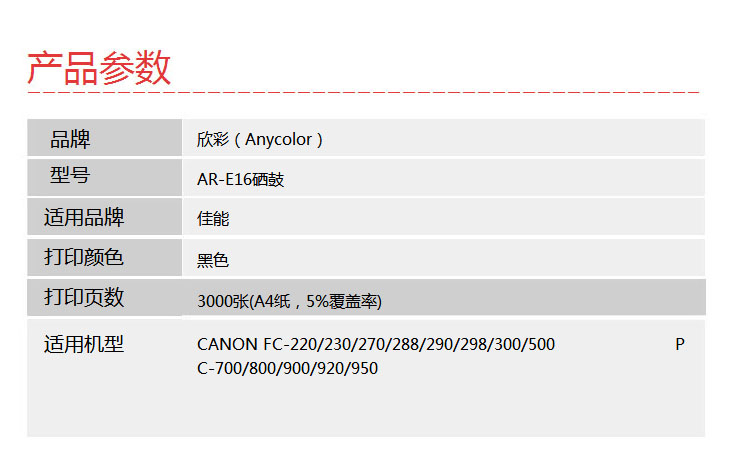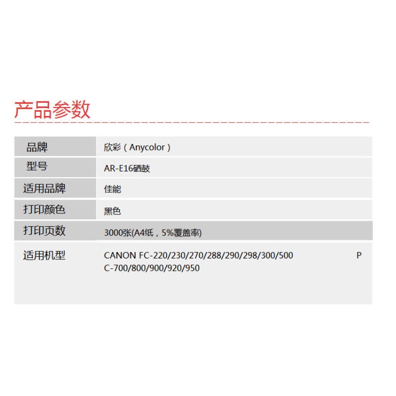 欣彩(Anycolor)E16硒鼓(專業(yè)版)AR-E16適用佳能CANON FC-220 230 270 288 290 298 300 500 PC-700